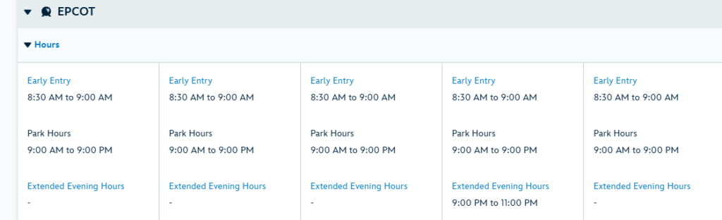Extended Evening Hoursは、特定のパークで、特定の曜日にしか開催されません(例:月曜はエプコット、水曜はマジックキングダムなど)。