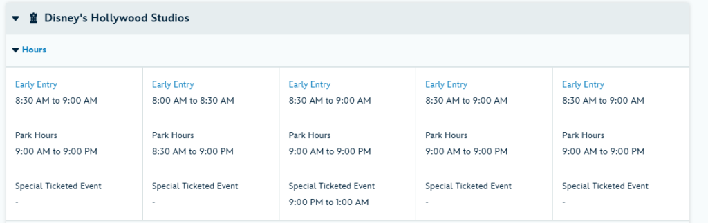 Hoursは毎日開催ではなく、特定のパークで特定の曜日のみ。予約前に公式カレンダーで必ず確認してほしい。