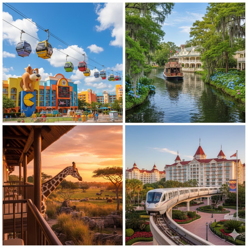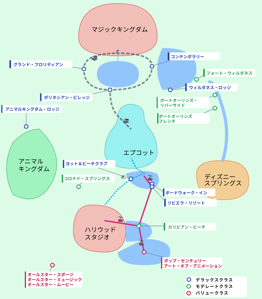 ランクだけでなく、どのエリアに泊まるかもホテル選びの大きなポイントだ。WDWのホテルは、4つのパークを中心に4つのエリアに分かれている。「どのパークで一番長く過ごしたいか」で拠点を決めると、移動の疲れが劇的に減る。